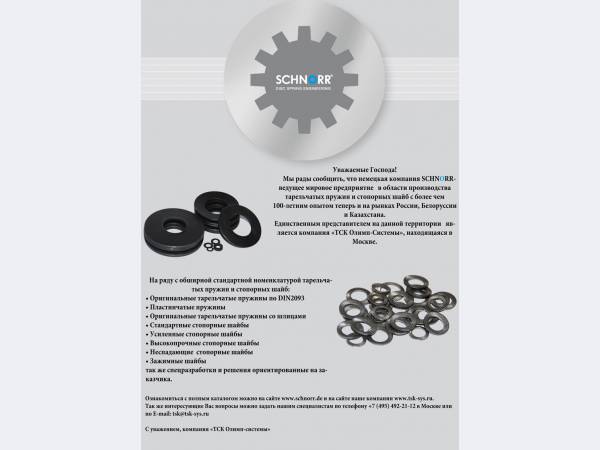 Компания SCHNORR (schnorr.de), производящей тарельчатые пружины (disc spring) высокого качества по DIN 2093 и оригинальные стопорные шайбы типа S, VS, HS и DIN6796. Вся продукция производится в Германии. SCHNORR. Является надежным партнером для крупных промышленных предприятий и корпораций, таких как: ABB, BorgWarner, Bosch, Daimler, Dürr, Eisenmann, Mahle, Siemens, Thyssen-Krupp, TRW, VW, ZF Sachs.