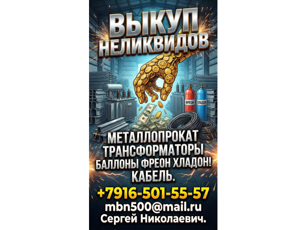"Московская База Неликвидов" На постоянной основе приобретает:Неликвиды предприятий и частных лиц.Складские остатки,Оптом склады,Остатки стройплощадок.Демонтаж Трансформаторных подстанций,Металлопроката с последующим выкупом как изделия.Рассмотрим все предложения! Самовывоз.Любая форма оплаты.тел 916 5015557 mbn500@mail.ru