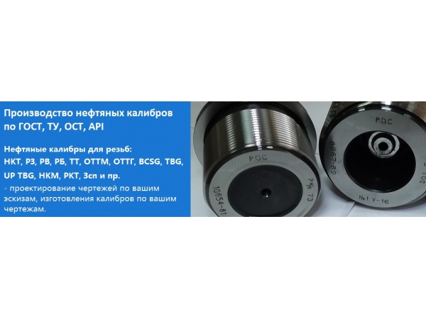 Калибры для всех типов резьб таких как: - обсадные ОТТМ, ОТТГ, ОГ1М, BCSG, - бурильных замковых резьб, РВ, BECO, - насосно-компрессорных НКТ, НКМ и прочих резьб. Производим калибры: - гладкие, - метрические, - конические, - трубные, - цилиндрические, - шпоночные, - трапецеидальные, - шлицевые рабочие, контрольные калибры к ним и многие другие по ГОСТ, ТУ, собственным чертежам и чертежам заказчика