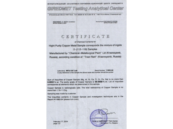 Производство и продажа меди особой чистоты 99,999% -99,9999%