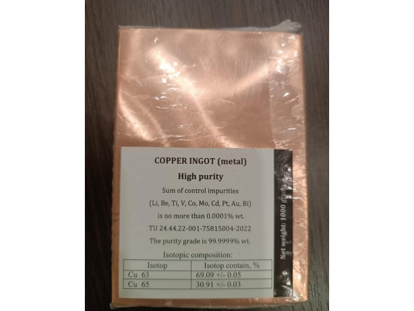 Медный слиток особой чистоты марки 6N. 99.9999%