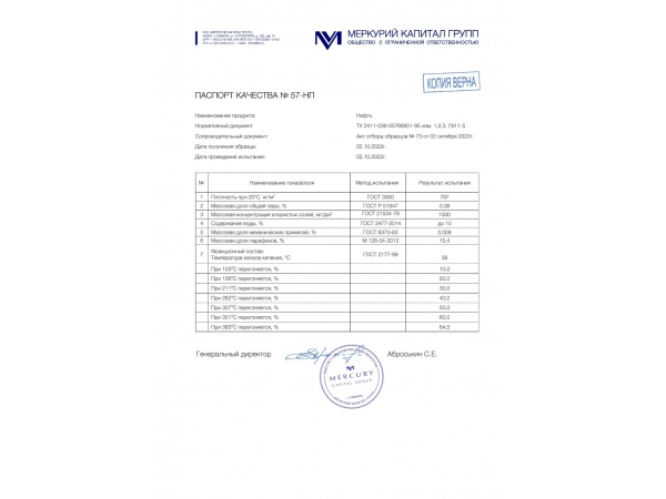 Предлагаем нефть ГОСТ Р51858-2002 сера-0, 21%; плотность 797, 0
